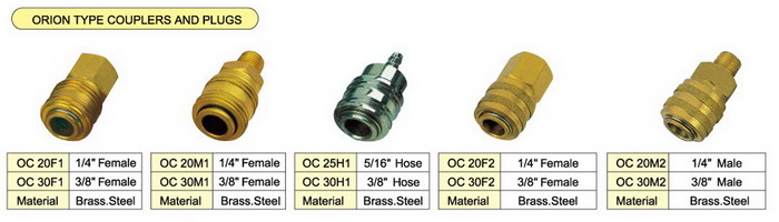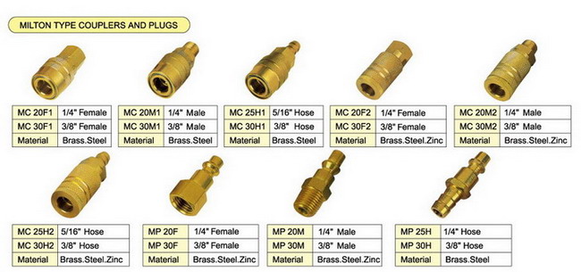 We supply varial type brass pneumatic couplers, including milton type couplers and plugs, Tru-flate couplers and plugs, ARO type couplers and plugs, Universal type couplers and plugs, ORION types couplers and plugs, etc. Every type has the femal thread couplers and plugs, male thread couplers and plugs, tubing couplers and plugs, and they’re exchangeable to each other, so that one series can meet many different connection needs. The milton type couplers and plugs, Tru-flate couplers and plugs, ARO type couplers and plugs, Universal type couplers and plugs are most popular in USA, and ORION type couplers and plugs are popular in Europe.