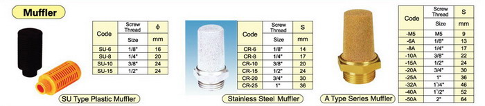 Mufflers (silencers) are widely used on valves, cylinders, or any pneumatic systems need a silencer to clean the exhaust air and reduce down the noise and some can adjust the flow rate. We manufacture different kind of mufflers for different conditions. The brass mufflers are most widely used, while plastic mufflers and stainless steel silencers are used in more special conditions. Our mufflers are normally from 1/8” to 1”, but some types has bigger size from M5 to 2”. We also manufacture very special mufflers according to customers requirement, for any of these special mufflers, just contact us immediately so that we can develop the exact mufflers as you want.