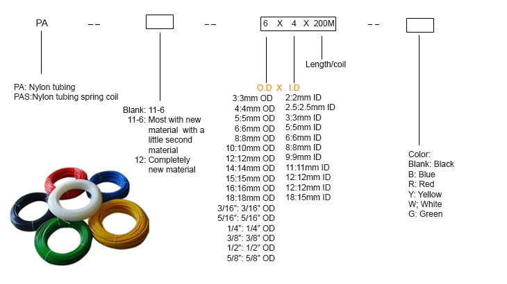 The Polyamide tubing (PA tube), also called nylon tube. Our nylon tubing normally has two types, PA 12 and PA 11-6. The PA 12 is completely done by new material, PA 11-6 is a little mixed with second material, both are of very good quality.