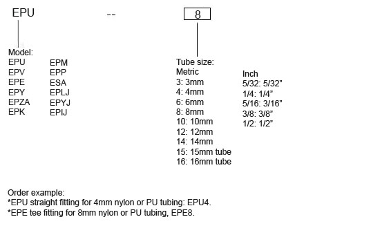 For plastic pneumatic fittings with one tubing connection and one thread connection, or several tubing connection in same size and one thread connection, please follow “How to order?” as below to get correct code: